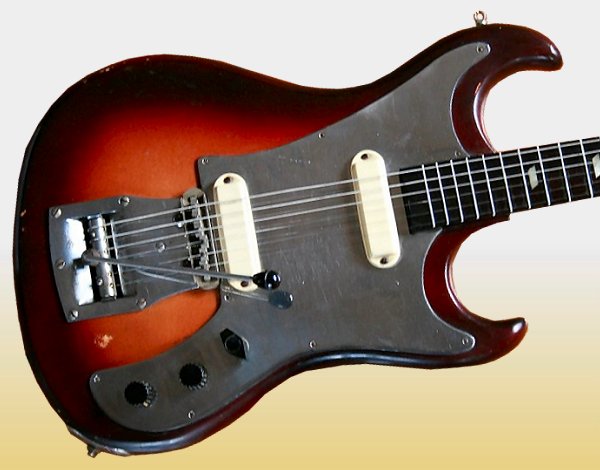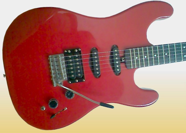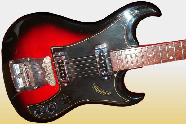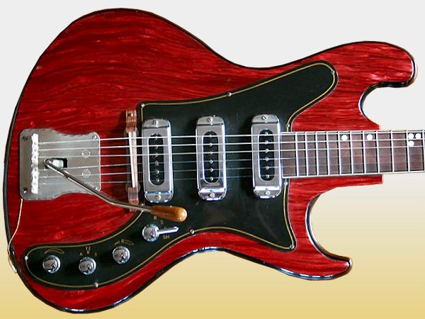 Über die Konfiguration des Mischpultes ist mir zur Zeit leider nichts bekannt. Offensichtlich scheint es dieses Instrument in zwei Variationen zu geben. Wer etwas mehr Geld zur Verfügung hatte, konnte (mit Glück) ein Instrument mit Vibrato erwerben, dessen Bezeichnung dann ein "V" für Vibrator angehängt wurde. Hier ein Bild einer solchen "Elektra Deluxe V": Bild 15: Musima Elektra Deluxe V aus den 70er Jahren Neben dem Toggle-Switch, der mit Sicherheit zur Auswahl der Tonabnehmer dienen dürfte, existieren vier Drehknöpfe, über deren Funktion man spekulieren kann. Da eine Beschriftung fehlt, kann man davon ausgehen, daß der sogenannte "Trickschalter" hier nicht zur Anwendung kommt. Vermutlich liegt hier also die klassische HH-Schaltung vor, wie sie von der "Les Paul" bekannt ist. Basierend auf den verwendeten Tonabnehmern wird die "Elektra Deluxe" vermutlich nicht vor 1974 produziert worden sein. 4.5. Migma Elektra DeluxeAuch wenn die Namensgleichheit zur "Musima Elektra Deluxe" markant ist, so läßt sich die "Migma Elektra Deluxe" mit ihr nicht wirklich vergleichen. Hier ein Bild: Bild 16: Migma Elektra Deluxe aus den frühen 60er Jahren Zunächst fällt die unterschiedliche Form des Korpus ins Auge. Auch der Hals-Korpusübergang ist deutlich anders. Der eingeleimte Hals geht bereits am 14. Bund in den Korpus über. Bei der Migma ist das erst am 17. Bund der Fall. Die drei Single-Coils von "SIMETO" sind schon von der "Musima Elgita" her bekannt. Folglich wurde die "Migma Elektra Deluxe" vor 1974 gebaut. Besonders bemerkenswert ist der Steg. Diese Bauform findet man eigentlich nur auf Schlag- und Jazzgitarren. Er ist zwar in der Höhe verstellbar, ermöglicht aber leider nicht eine individuelle Einstellung der Oktavreinheit. Vermutlich wurde dieser Steg nur aus Gründen der Rationalisierung verwendet. Man sparte sich damit die Produktion einer deutlich aufwendigeren Brücke. Das "Mischpult" ist mit dem der "Musima Eterna" zu vergleichen: Zwei Lautstärkeeinsteller für Solo- und Melodie, ein "Trickschalter" zur Tonabnehmerwahl, sowie ein weiterer Schalter für den mittleren Tonabnehmer. Der Korpus erweckt zunächst den Eindruck, als ob hier ein Stück massives und exotisches Holz verwendet wurde. Schaut man sich den Korpus allerdings etwas genauer an, so kommen doch gewisse Zweifel auf. Bild 17: Korpus der Migma Elektra Deluxe An der Zarge der Cutaways ist ein gänzlich anderer Verlauf der Maserung festzustellen und an der Kante zur Rückseite ist ein deutlicher Übergang zu erkennen. Fast scheint es so, als ob das eigentliche Korpusholz unter einem Furnier oder gar einer Kunststoffschicht verborgen wurde. Tatsächlich wurde der Korpus mit farbigem Zelluloid beschichten, wie es auch beim Bau von Akkordeons verwendet wurde. 4.6. Es geht auch modern - die Musima Lead StarNachdem in den 80er Jahren die "Superstrat" modern wurde, verschwanden weltweit bei vielen Herstellern nach und nach die alten, eigenständigeren Modelle. Man paßte sich eben den Anforderungen des Marktes an. Die Vorstufe stellt die sogenannte "Rockstrat" dar, eine Elektrogitarre in Form der "Fender Stratocaster", bei der an der Stegposition ein Humbucker eingebaut wurde. Diesem Trend stellte man sich bei "Musima" offensichtlich auch nicht entgegen und so findet man in den 80ern dort unter anderem diese "Lead Star": Bild 18: Musima Lead Star mit HSS-Konfiguration Dieses Instrument könnte so auch in irgendeiner anderen Fabrik irgendwo auf der Welt produziert worden sein. Die Ähnlichkeit zur "Stratocaster" ist unverkennbar! Die "Lead Star" gab es sowohl mit den klassischen drei Single-Coils, also auch in der hier gezeigten HSS-Konfiguration. Auffallend sind das typische Fehlen des Pickguard sowie die etwas altertümlich wirkende Halseinstellschraube am Halsfuß. Neben diesen beiden, eher als traditionell zu bezeichnenden Formen, gibt es noch weitere Varianten mit abgewinkeltem "Jackson"-Kopf und einem Korpus der noch mehr in Richtung "Superstrat" geht. |
