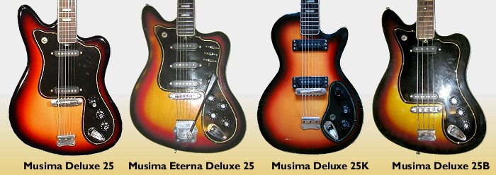 Im weiteren Verlauf wird jedoch noch deutlich werden, daß diese Aussagen vermutlich nicht ganz korrekt sind. Aber sehen wir uns einmal die 4 Instrumente an: Bild 14: Die Musima 25 Serie Die Musima Deluxe 25Die "Deluxe 25" ist als Kopie der "Jazzmaster" oder "Jaguar" aufzufassen, die in den frühen 70er Jahren gebaut wurde. Ihre Mensur beträgt 640mm und ist damit ein wenig ungewöhnlich, denn sie orientiert sich weder an der "Stratocaster", noch an der "Les Paul". Mit umgerechnet 25,2" liegt sie da irgendwie in der Mitte. Hier die Beschreibung aus einem Katalog von 1982: 6-saitige Elektrogitarre mit vielseitigen Klangvariationen, 640mm Mensurlänge, Oberfläche furniert, formgerecht ausgearbeitet, Hochglanz poliert, Hals mit unsymmetrischem Schaufelkopf, verstellbarem Metallstab, aufgeschraubte Einzelmechanik, gewölbtes Palisandergriffbrett mit weißem Griffbrettrand, weiße Griffbretteinlagen, Neusilberbünde. Man sagt der "Deluxe 25" einen dünnen und höhenlastigen Klang mit sehr geringem Sustain nach. Für den Hals wurde ebenfalls die bekannte Zweipunktverbindung verwendet. Da die Halstasche nicht besonders tief ist, dürfte die "Deluxe 25" an dieser Stelle stark bruchgefährdet sein. Die Musima Deluxe 25KDieses Instrument orientiert sich von der Form her an der bekannten "Les Paul", ist jedoch ein wenig schlanker. Im Katalog ist folgendes zu lesen: Asymetrisches Modell, 6 saitig, 620mm Mensur, Oberfläche furniert, Korpus schattiert, Ahornhals mit nachspannbarem Metallstab, gewölbtes Palisandergriffbrett mit Einlagen, Weißer Decken,- Boden,- Griffbrett- und Halsrand. Einzelmechanik, ferromagnetischer Saitenbezug. Zwei neuentwickelte leistungsfähige, in der Höhe verstellbare Tonabnehmer mit Einzelmagneten, die über einen Dreistellungen-Kippschalter wahlweise einzeln oder zusammen eingeschaltet werden können. Hier sind deutlich Diskrepanzen zur allgemeinen Spezifikation der Serie bei Cheesy Guitars festzustellen! Neben dem Unterschied bei den verwendeten Hölzern für den Hals wird in einer anderen Quelle von einer Mensur von nur 610mm gesprochen. Aufgrund dieser bemerkenswert geringen Mensur wird in einigen Quellen vermutet, daß das "K" für "Kindergitarre" steht. Allerdings ist die Mensur der "Deluxe 25K" für diese Anwendung immer noch deutlich zu groß, sodas diese Vermutung wohl eher unzutreffend sein dürfte. Die Musima Eterna Deluxe 25Färbt man das Griffbrett der "Deluxe 25" schwarz ein, um Ebenholz zu imitieren und fügt einen dritten Tonabnehmer nebst erweiterter Elektronik zu, dann erhält man die "Eterna Deluxe 25". Bei einem so aufwendigen Instrument darf dann natürlich auch ein Vibrato nicht fehlen. Hier der Ausschnitt aus dem Katalog: Asymmetrische 6-saitige Elekrtogitarre, Oberfläche furniert, schattiert, Hochglanz poliert, Hals mit nachspannbarem Metallstab, unsymmetrischer Schaufelkopf, gewölbtes Ebenholzgriffbrett mit Einlagen, weißer Griffbrettrand, Neusilberbünde, höhenverstellbarer Steg mit separater Feineinstellung der Mensur. Mit dieser Aussage und den Angaben von Karl-Heinz Neudel steht es 2:1. Folglich muß man die auf Cheesy Guitars zu lesende Aussage über das eingefärbte Griffbrett der "Eterna Deluxe 25" also zurückweisen. Aufgrund dieser Spezifikation stellt das Instrument sozusagen das Spitzenmodell der Serie dar. Es war seinerzeit kaum in der DDR zu erhalten. Entweder wurden die Instrumente in den Westen exportiert, um Devisen zu beschaffen oder sie wurden aufgrund von Handelsabkommen mit der Sowjetunion an das sozialistische Bruderland geliefert. Der Musima Deluxe 25BZu guter Letzt gab es noch den Baß "Musima Deluxe 25B" über den der Katalog sagt: Elektro-Baß-Gitarre, 4-saitig, 800mm Mensurlänge, 1 Tonabnehmer (Hals) mit 4 Magneten und 1 Tonabnehmer (Steg) mit 8 Magneten. Dieses Instrument stellt letztendlich nichts anders als die Baß-Version der "Musima Deluxe 25" dar, wie der Vergleich von Korpusform und Bedienelementen deutlich zeigt. Interessant ist die Mensur von 800mm (31,5"). Fender hat mit der Mensur seiner Long-Scale-Instrumente "Precision Bass" und "Jazz Bass" quasi einen Standard gesetzt. Sie beträgt 34", also 863,6mm. Die etwas älteren Bässe haben nur eine Mensur von 30" (762mm) und sind ihren längeren "Kollegen" aufgrund der Biegesteifigkeit der dicken Baßsaiten im Hinblick auf die Tonreinheit grundsätzlich unterlegen. Der "Deluxe 25B" gehört mit seiner Mensur also in die Gruppe der medium-scale Bässe. 4.4. Musima Elektra DeluxeDie "Elektra Deluxe" scheint eine gewisse Verwandtschaft zur "Musima 25 Serie" aufzuweisen. Nach Cheesy Guitars gilt angeblich folgende Spezifikation: