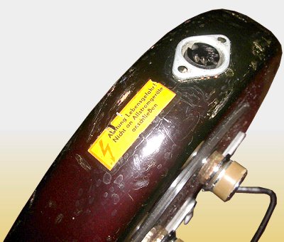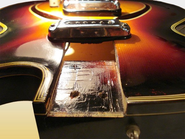 Hier wurde also ein Mix aus "Stratocaster" "Jaguar" und "Les Paul" realisiert: Form und Mensur von der Strat, absolute Tonabnehmerposition von der Paula, sowie die Tonabnehmercharakteristik und das Vibrato von der "Jaguar". Anschluß findet die "Elgita" über eine sogenannte "Diodenbuchse", wie sie in den 60er und 70er Jahren auch in Rundfunk- und Tonbandgeräten verwendet wurde. Da man das Instrument auf diese Weise auch leicht mit dem Tonbandeingang eines Radios verbinden konnte, sah man sich gezwungen, eine Warnung in unmittelbarer Nähe der Buchse anzubringen: Bild 9: Die Anschlußbuchse der Elgita Diese Warnung gilt für den Fall, daß der begeisterte Musiker ein altes Röhrenradio in Allstromtechnik als Verstärker mißbrauchen will. Solche Geräte verfügen nicht über ein galvanisch getrenntes Netzteil, sodas die Schaltungsmasse unter Umständen mit der Phase der Netzspannung verbunden wird, was für den Benutzer die Gefahr eines tödlichen elektrischen Schlages beinhaltet. Diese Warnung gilt natürlich generell für die Nutzung einer Elektrogitarre an einem solchen Gerät, unabhängig davon, ob eine Diodenbuchse oder die bekannte Klinkenbuchse verwendet wird! 4.2. Die Musima RecordDas Modell "Record" stellt in seiner letzten Inkarnation aus den frühen 70er Jahren eine sogenannte "Thinline" dar, die durchaus mit der "ES-330" von "Gibson" oder der "Casino" von "Epiphone" zu vergleichen ist. Der Korpus ist also vollständig hohl. Der Ursprung dieses Instrumentes läßt sich auf den deutschen Gitarrenbauer Wenzel Rossmeisl zurückführen, der seit den 30er Jahren Jazzgitarren baute. Nach dem Krieg wurde er aus Schönbach vertrieben und produzierte zunächst in Berlin in der Martin-Luther-Straße 27 und später dann in Markneukirchen. 1951 wurde Rossmeisl wegen angeblicher Devisenvergehen inhaftiert und der Betrieb enteignet. Nach seiner vorzeitigen Haftentlassung im Jahre 1953 wurde er in den Westen abgeschoben. 1955 begann er in einer neuen Werkstatt in Mittenwald wieder Gitarren herzustellen. Seine Firma in der DDR wurde 1952 Bestandteil des neugegründeten "VEB Musima Markneukirchen". Die "Record" wurde aus dem Modell "Roger Super" von Rossmeisl entwickelt. Beide Instrumente weisen den für Rossmeisl typischen "German Carve" sowie die katzenaugenförmigen Schallöcher auf. Beim "German Carve" wird die Decke (und manchmal auch der Boden) so geschnitzt, daß ein starker Wulst am Deckenrand entsteht. Durch diese besondere Deckenform weist das Instrument keine gleichmäßige Wölbung der Decke auf, sondern ist im mittleren Bereich fast eben. Aus der ursprünglichen Archtop wurde dann im Laufe der Zeit in mindestens drei Schritten eine elektrifizierte Thinline entwickelt, wobei die Form von Decke und Boden jedoch erhalten blieb. Wie stark die Verwandtschaft zur "Roger Super" tatsächlich ist, läßt sich anhand des folgenden Bildes erkennen. Es zeigt eine "Roger Super Cutaway" aus westdeutscher Fertigung und zwei Varianten der "Musima Record", die Modelle 15 und 17 die ca. 1965 und 1973 in der DDR gebaut wurden: Bild 10: Musima Record und Roger Super - Verwandte aus Ost und West Laut einer Spezifikation aus dem Jahre 1969 soll der Hals aus Riegelahorn mit Ebenholzgriffbrett bestehen. Zargen und Boden wurden ebenfalls aus Riegelahorn gefertigt, wohingegen für die Decke Fichte verwendet wurde. Andere Quellen sprechen auch von Pinie als Deckenholz. Was jetzt stimmt oder ob alle Recht haben... wer weiß das schon? Mit ihrer handgeschnitzten Decke und einem potentiellen Ebenholzgriffbrett, darf sich die "Record" schon in gewisser Weise als "Meistergitarre" bezeichnen. Da die meisten anderen Thinlines oder Archtops von "Musima" Decken aus Sperrholz hatten, stellte die "Record" diesbezüglich sicherlich das Spitzenmodell dar. Allerdings gibt es hier auch ein paar bemerkenswerte Dinge, die darauf hindeuten, daß manchmal etwas abseits der "reinen" Lehre gefertigt wurde: Augenscheinlich verfügen alle Instrumente aus Bild 10 nicht über eine einstellbare Stahleinlage im Hals. Die "Roger Super" glänzt hier jedoch durch einen Hals, der vermutlich aus sieben Streifen verschiedener Hölzer zusammengesetzt wurde. Eine solche Konstruktion zeichnet sich durch eine große Stabilität und Verwindungsfreiheit aus, sodas man unter Umständen durchaus auf eine Stahleinlage verzichten kann. Bei der "Record" scheint der Hals aus einem Stück zu bestehen, womit man ihn, aufgrund der fehlenden Stahleinlage, wohl zu Recht als Schwachpunkt bezeichnet kann. Bei einer hochwertigen Jazzgitarre erwartet man eigentlich immer, daß der Hals im Korpus eingeleimt wird. Mit diesem Feature kann die "Record" leider nicht dienen, denn hier ist der Hals nachweislich angeschraubt: Bild 11: Die Halsbefestigung der Musima Record Wie dem Bild zu entnehmen ist, gibt es mindestens drei Varianten der Halsbefestigung. Die beiden links dargestellten Formen hinterlassen dabei einen stabileren Eindruck, denn hier weisen die Schrauben einen deutlich größeren Durchmesser auf. Das Fehlen einer massiven Halsplatte, wie man sie zum Beispiel bei der "Stratocaster" findet, legt die Vermutung nahe, daß die eigentliche Kraft von einem im Korpus befindlichen Holzblockes aufgenommen werden muß. Nimmt man den Hals ab, so bietet sich das folgende Bild: Bild 12: Die Halstasche der Musima Record mit Zweipunkthalsbefestigung Hier ist tatsächlich ein Holzblock zu erkennen, durch den die beiden Schrauben gehen. Er ist in etwa sechs Zentimeter lang. Im Inneren der beiden Löcher sind die Spuren der Gewinde zu erkennen. Sie nehmen also die gesamte Verbindungskraft auf. Bei der "Stratocaster" werden die immerhin vier Schrauben nur in den Halsfuß geschraubt. Korpusseitig wird die Gegenkraft durch die metallische Halsplatte auf eine größere Fläche verteilt und die Bohrungen im Korpus sind so groß, daß die Schraubengewinde hier nicht fassen. Den Hals einer solchen Gitarre wird man mit Sicherheit häufiger abnehmen können, ohne eines der "Gewin