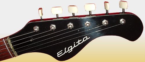 4. InstrumenteDer Musikerwinkel im Vogtland ist reich an verschiedenen Gitarren, die im Laufe der letzten 50 Jahre gebaut wurden. Sie alle vorstellen zu wollen, gleicht der Quadratur des Kreises und so möchte ich mich hier auf einige wenige Elektrogitarren von "Musima" und "Migma" beschränken. 4.1. Die Musima ElgitaMan nehme einen Korpus in der bekannten Form der "Stratocaster", würze mit einem Vibrato nebst "Roller Bridge" und zwei Single-Coils, modifiziere den Korpus etwas in Richtung "Bison" und fertig ist sie, die "Elgita"! Von der Form her lehnte man sich bei diesem Instrument tatsächlich eng an die "Bison" des britischen Herstellers "Burns" an. Aufgrund des Vibratos und der Tonabnehmerkonfiguration könnte man auch an eine "Jaguar" denken, die 1962 erstmalig erschien. Im Katalog wird die "Elgita" als "Vollelektrische asymmetrische Jazzgitarre mit Stiletto-Hals" beschrieben. Über die verwendeten Materialien wird jedoch vornehm geschwiegen. Der Hals wird mit Hilfe zweier relativ dünner Schrauben und einer kleinen Blechplatte mit dem Korpus verbunden. Unter der Annahme, daß keine weiteren Maßnahmen zur Befestigung erfolgt sind, scheint hier eine Schwachstelle vorzuliegen. Eine Strat oder Tele kann man notfalls auch als Tennisschläger verwenden, ohne den Hals sofort und dauerhaft vom Korpus zu trennen. Bei der "Elgita" sollte man von solchen Versuchen vermutlich besser absehen! Der schmale Sattel besteht aus einfachem Plastik und muß die Saiten nur in Position halten, da das Instrument über einen sogenannten "Nullbund" verfügt. Auch die Kopfplatte der "Elgita" ist eine Bemerkung wert. Hier ein Bild: Bild 6: Der Kopf einer Elgita Im Vergleich zur "Stratocaster" hat die "Elgita" einen wesentlich längeren Kopf, was dem erstaunten Musiker dann schon einmal eindringlich die Endlichkeit der mechanischen Länge einer handelsüblichen e'-Saite demonstriert. Werfen wir jetzt einen Blick auf den Korpus einer "Elgita": Bild 7: Restaurierte Musima Elgita aus den 70er Jahren Zwei Lautstärkeeinsteller und ein Trickschalter bilden das sogenannte "Mischpult". Die verwendeten "SIMETO"-Tonabnehmer sind mit Hilfe zweier Schrauben direkt auf dem Schlagbrett montiert. Aufgrund ihrer Konstruktion kann man sie am ehesten mit einem "P-90" vergleichen. Es gibt jedoch noch eine weitere Variante der "Elgita", welche schmalere Tonabnehmer verwendet, wie das nächste Bild beweist: Bild 8: Elgita mit schmalen "SIMETO"-Tonabnehmern aus den frühen 60er Jahren Hier scheint man auch bezüglich der Tonabnehmer bei der "Stratocaster" abgeschaut zu haben. Welche der beiden Modelle zuerst da war, läßt sich nur mit Hilfe der Tonabnehmer klären. Entsprechend müßte die "Elgita" aus Bild 8 eigentlich vor dem Instrument aus Bild 7 hergestellt worden sein. Aus der mechanischen Breite von mir vorliegenden breiten "SIMETO"-Tonabnehmern und verschiedenen Fotos einer "Elgita" wurden folgende Daten ermittelt: