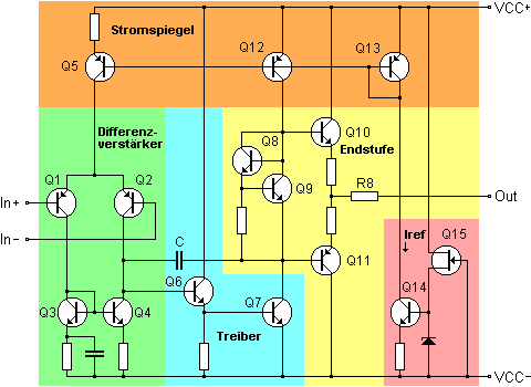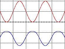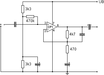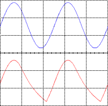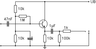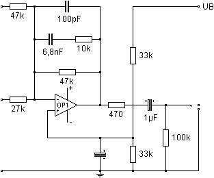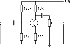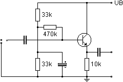 3. EffektgeräteEffektgeräte sind, im Gegensatz zum Instrumentenverstärker, nicht das Ende der Klangkette. Insofern sollte man nicht nur den Eingangseigenschaften, sondern auch dem Ausgang Beachtung schenken. Auch die Betriebsspannung ist von Bedeutung, denn bei den typischen 9V sind keine so großen Signalamplituden möglich. In der Theorie kann man von 4,5Vs ausgehen. In der Praxis geraten die Schaltungen jedoch schon deutlich früher in die Begrenzung. 3.1 EingangsschaltungenBei Effektgeräten kann der Eingangswiderstand ganz unterschiedlich ausfallen, was häufig auch die Begründung für einen Verlust von hohen Frequenzen ist und den Schrei nach dem "True-Bypass" zur Folge hatte. Je nach Schaltungskonzept trifft man hier auf Werte zwischen 19kOhm und 1MOhm. In der Kategorie "Booster" findet man eine ganze Reihe von relativ alten Effektgeräten, die bei Licht betrachtet, alle gleich aufgebaut sind. Da es damals noch keine preiswerten und hochwertigen Operationsverstärker gab, findet man hier die klassische analoge Schaltungstechnik: Bild 14: Typische Eingangsstufe eines "Screaming Bird" und des "LBP" Hier hängt der Eingangswiderstand der Schaltung vom Eingangsspannungsteiler, dem Emitterwiderstand und dem Stromverstärkungsfaktor des Transistors ab. Nimmt man für die streuende Stromverstärkung einen Bereich von 100 bis 800 an, so ergibt sich ein Eingangswiderstand zwischen 19,5kOhm und 35kOhm. Die Verstärkung bewegt sich im Bereich von 18 (25dB). Aus diesem Grund wird eine Vollaussteuerung schon ab einer Eingangsspannung von 100mVs erreicht. Eine Eingangsspannung von 200mVs führt zu einem Klirrfaktor von fast 10%, der auf dem Oszilloskop auch deutlich zu erkennen ist: Bild 15: Verzerrungen (blau) beim "Screaming Bird" Mehr als 200mVs sollte man also keinesfalls verwenden, da das Signal ansonsten einseitig hart begrenzt wird! Besser man bleibt bei 100mVs, was dann zu einem Klirrfaktor von "nur" 3% führt. Dieser vergleichsweise schlechte Wert ist durch die schwache Gegenkopplung begründet. Das ist halt der Preis der hohen Verstärkung! Eine bestätigende Aussage findet man im Forum des Musikding. Hier schrieb das Mitglied lmkv15 am 03.12.2008: Zitat lmkv15: Beim "Screaming Bird" von einer "Eingangsschaltung" zu sprechen, ist allerdings etwas gewagt, denn da diese Ein-Transistor-Schaltung bereits komplett ist, kann man genau so gut von einer "Ausgangsschaltung" reden! Hier ist dann auch der Ausgangswiderstand von Bedeutung. Er ist keinesfalls größer als 10kOhm. In der Praxis kann man von diesem Wert auch ausgehen, wenn man den Widerstand des Transistors vernachlässigt. Unter der zum japanische Hersteller Roland gehörenden Marke Boss wird eine Vielzahl von Effektgeräten vertrieben, welche die folgende Eingangstufe aufweisen: Bild 16: Typische Eingangsstufe modernen Effektes (hier "Boss BF-2") Durch die geänderte Vorspannungserzeugung und den vergrößerten Emitterwiderstand ergeben sich hier Eingangswiderstände von 327kOhm bis zu 459kOhm. Diese Streuung resultiert aus der Tatsache, daß der Eingangswiderstand auch vom Stromverstärkungsfaktor des Transistors abhängig ist. Und da dieser stark streut, wie man dem Datenblättern entnehmen kann... Der Hersteller selber gibt in der Spezifikation des "BF-2" einen Eingangswiderstand von 470kOhm an. Nun ja, wenn man ein Auge zudrückt... Die Empfindlichkeit oder besser gesagt der Aussteuerbereich, beträgt bis zu 2,6Vs (1,84Veff) bei einem Klirrfaktor von 0,7%. Normale Elektrogitarren, sollten diesen Eingang daher nicht in Schwierigkeiten bringen. Die Verstärkung beträgt typisch 0,979 (-0,2dB). Dieser Spannungsfolger stellt daher ein typisches Bauelement des Interfaceringes dar. In der Eingangsstufe des "DF-2" ersetzt Boss einfach den NPN-Transistor durch einen Feldeffekttransistor. Diese Schaltung bietet den großen Vorteil, daß der Eingangswiderstand nur noch von einem Widerstand bestimmt wird. Er beträgt in diesem Fall 1MOhm. Bild 17: FET-Eingangsstufe des "Boss DF-2" Wo Licht ist, ist aber leider auch immer Schatten und so beträgt die Spannungsverstärkung dieser Schaltung typisch nur 0,85 (-1,5dB), was durch die geringe Steilheit der Feldeffekttransistoren begründet ist. Wenn, neben einem großen Eingangswiderstand, auch noch Verstärkung gefragt ist, bietet sich der Einsatz eines Operationsverstärkers an: Bild 18: OP-Eingangsstufe des "Boss GE-7" Im "GE-7" beträgt der Eingangswiderstand 470kOhm und er wird wiederum nur durch einen Widerstand bestimmt. Die Verstärkung ist 11 (20,8dB). Die zu Harman Kardon gehörende amerikanische Firma Digitech verwendet im "RP-1", einem sogenannten "Multieffektgerät", eine sehr ähnliche Schaltung. Da eine symmetrische Versorgungsspannung zur Verfügung steht, fehlt der Spannungsteiler für den Arbeitspunkt des Eingangs. Wie schon im "GE-7" beträgt der Eingangswiderstand 470kOhm. Allerdings begnügt man sich im "RP-1" schon mit einer Verstärkung von 2 (6dB). Bild 19: OP-Eingangsstufe des "Boss RP-1" Bemerkenswert ist die weitere Beschaltung des Eingangs. Hier wurde ein passiver Bandpaß realisiert, der aus einem Tiefpaß mit nachgeschaltetem Hochpaß besteht. Die beiden Eckfrequenzen sind 33Hz und 133kHz. Die Hochpaßeigenschaft kann man eigentlich "vergessen" und so besteht die Hauptaufgabe hier wohl darin, das Eindringen hochfrequenter Rundfunksignale zu unterdrücken; im Grunde genommen die gleiche Funktion, die durch die Grid Stopper in den Röhrenschaltungen übernommen wird. 3.2 AusgangsschaltungenAuch bei den Ausgangsschaltungen trifft man auf eine gewisse Vielfalt. Häufig müssen technische Belange jedoch hinter monetären Begründungen zurückstehen, wie noch gezeigt wird. Den Anfang macht die Ausgangsstufe des "BF-2" von Boss, die stellvertretend für viele andere Zeitachseneffekte dieses und anderer Hersteller dient. Hier hat man versucht, "mehrere Fliegen mit einer Klappe zu schlagen". Aus funktionaler Sicht besteht die Notwendigkeit das originale Signal und das z
