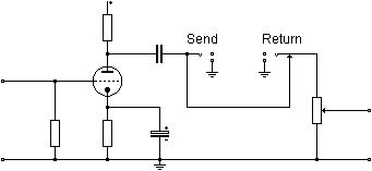 Hier sind also insgesamt vier längere Kabelstrecken vorhanden. Effektiv muß man sogar von zwei unabhängigen Effektketten sprechen! Entsprechend kann und muß man sogar jede dieser beiden Ketten aus elektrischer Sicht für sich betrachten, wie es bereits gezeigt wurde. Besondere Beachtung verdient der externe Effektweg von Verstärkern. Dieser ist, gerade bei älteren Geräten, häufig passiv ausgeführt. Die Signalkette wird dazu im Gerät einfach unterbrochen: Bild 32: Einfache passive Effekt-Loop eines Verstärkers Da der Ausgangswiderstand einer Röhrenstufe in der Regel im Bereich mehrere hundert Kiloohm liegt, kann man sich das resultierende Problem schnell ausmalen: Die Schaltung kann keine niederohmigen Lasten treiben und schon ein kurzes Kabel kann alle Höhen verschlucken! Daß im gezeigten Beispiel noch einige andere Sünden enthalten sind, soll hier nicht weiter betrachtet werden. Hier ist also ein Nachbau nicht zu empfehlen, sondern man sollte es nur als schlechtes Beispiel nehmen! |