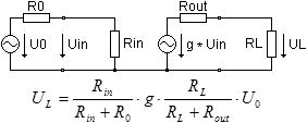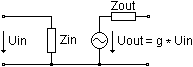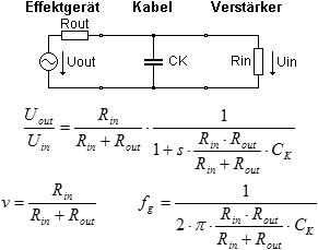 Gerade der letzte Punkt ist bei einer passiven Elektrogitarre nicht gegeben, denn das Instrumentenkabel übt einen starken Einfluß auf den entstehenden Klang aus. Nimmt man ein anderes Kabel, so verändert sich die Kapazität mit der der Tonabnehmer belastet wird und es klingt anders. Würde man die Gitarre durch eine geeignete aktive Schaltung jedoch vom Kabel trennen, so wäre dieser Einfluß nicht mehr wirksam und der entstehende Klang vom angeschlossenen Kabel unabhängig. Die Elemente des Interface bestehen in erster Linie aus unterschiedlichen Verstärkern, die zunächst für eine rückwirkungsfreie Entkopplung der Funktionseinheit sorgen. Wenn man von Außen in das Gerät "hineinschaut", dann sieht man einige charakteristische Eigenschaften, die mit den Nachbargeräten in der Kette wechselwirken: Einem Eingang ist in erster Linie der sogenannte Eingangswiderstand zuzuordnen, der als Last für das vorhergehende Gerät fungiert. Für den Ausgang sind zwei Größen wichtig: Der Ausgangswiderstand und die maximale Ausgangsspannung, die an eine definierten Last geliefert werden kann. Beim "BF-2" von Boss wird zum Beispiel eine "Input Impedance" von 470kOhm sowie eine minimale "Output Load Impedance" von 10kOhm angegeben. Die Angabe der dabei möglichen Ausgangsspannung fehlt leider. Der Ausgangswiderstand ist besonders wichtig, denn er bildet zusammen mit dem Eingangswiderstand des nachfolgenden Gerätes einen Spannungsteiler und sorgt so für eine - unter Umständen merkliche - Verringerung der Signalamplitude. Ein vergleichbares Verhalten gilt dann natürlich auch für den Eingangswiderstand unseres Gerätes in Kombination mit dem Augangswiderstand des vorhergehenden Gerätes. Im weiteren Verlauf beschränken wir uns auf die Betrachtung der eben genannten Größen. Wie die betreffenden Schaltungsteile im Detail funktionieren, ist dann nicht von besonderem Interesse. 1.2. Die Kopplung von FunktionsblöckenGemäß den eben gemachten Ausführungen, kann man einen Funktionsblock aus elektrischer Sicht allgemein wie folgt beschreiben: Bild 2: Funktionsblock als elektrisches Modell (Vierpol) Auf der Eingangsseite sehen wir eine Eingangsimpedanz Zin, über der die Eingangsspannung Uin abfällt. Wir fassen Zin in den meisten Fälle als rein ohmsch auf und schreiben deshalb Rin. Sollte der Eingang ebenfalls eine parallele Kapazität aufweisen, so muß sie dann parallel zu Rin als Cin berücksichtig werden. Der Ausgang besteht aus einer Reihenschaltung einer idealen Spannungsquelle Uout und der Ausgangsimpedanz Zout, die in der Regel wieder als Rout und damit als ohmsch aufgefaßt wird. Die Ausgangsspannung ist jetzt über den Übertragungsfaktor g mit der Eingangsspannung verknüpft. In diesem Modell entspricht g einer Verstärkung oder einer Dämpfung. Uout ist also eine abhängige Größe, eine gesteuerte Spannungsquelle. Eine eventuelle Rückwirkung des Ausgangs auf den Eingang ist denkbar, wird jedoch in diesem Modell, aufgrund der Eigenschaften moderner Transistoren, vernachlässigt. Im Übertragungsfaktor g steckt die eigentliche Funktion des Blocks. Im Falle eines Verstärkers ist g für alle Frequenzen eine konstante Größe. Bei einem Filter verändert g zum Beispiel seinen Wert in Abhängigkeit der Frequenz. Natürlich kann man sich noch andere Modelle vorstellen. Insbesondere bei Transistoren wird am Ausgang gerne eine Stromquelle mit parallelem Leitwert verwendet. Am Ergebnis ändert das jedoch nichts. Hier wird der Übertragungsfaktor g lediglich durch die sogenannte "Steilheit" ersetzt. Erzeugen wir jetzt in Gedanken eine einfache Übertragungskette mit einer Quelle U0, dem Funktionsblock und einer Last RL: Bild 3: Funktionsblock mit Signalquelle U0 und Last RL Man erkennt auf beiden Seiten Spannungsteiler, die aus R0 und Rin sowie aus Rout und RL gebildet werden. Sie verringern grundsätzlich die Spannung. Es existieren also insgesamt drei Übertragungswerte, die miteinander multipliziert werden: Die der beiden Spannungsteiler und g. Damit ist klar geworden, daß die Ein- und Ausgangswiderstände bezüglich der Übertragungseigenschaft der gesamten Kette durchaus eine Rolle spielen können! Sind alle Widerstände rein ohmsch, dann tritt lediglich eine konstante Dämpfung über alle Frequenzen auf. Anders sieht es jedoch aus, wenn einige Elemente Impedanzen sind, also zum Beispiel auch eine kapazitive Wirkung haben. Dann wird das entsprechende Übertragungsverhalten frequenzabhängig. Die passive Elektrogitarre als Signalquelle ist dafür ein gutes Beispiel: Der Eingangswiderstand dämpft hier die Resonanz des Tonabnehmers, der ja tatsächlich eine Impedanz ist, und eine kapazitive Belastung - zum Beispiel durch das Instrumentenkabel - verschiebt die Resonanzfrequenz nach unten. Sehen wir uns zum Schluß einen typischen Fall an: Das letzte Effektgerät in der Kette (es könnte natürlich auch eines aus der Mitte sein) wird über ein Kabel mit dem Verstärkereingang verbunden. Hier die elektrische Situation: Bild 4: Kopplung mit kapazitiver Last Die Übertragungsfunktion besteht aus zwei Faktoren: Einem konstanten proportionalen Anteil, der als Verstärkung v aufgefaßt werden kann (auch wenn sie im vorliegenden Fall kleiner als 1 und daher eine Dämpfung ist) und einem Tiefpaß, der unter anderem durch CK definiert wird und eine Grenzfrequenz fg aufweist. Jetzt wird es praktisch! Unser gedachter Gitarrist benutzt einen selbstgebauten Booster (sein ganzer Stolz) vor seinem - wie könnte es anders sein? - Marshall-Amp. Da die Gitarre mit dem "Vogel" zu laut ist, wird der "Low"-Eingang des Verstärkers benutzt. Damit sei Rout=33kOhm (angenommen) und Rin=136kOhm (bekannter Wert). Beim Kabel kommt es ja nicht so darauf an. In der Kiste fanden sich noch 15m. "Also her damit! Schneid' ich später mal ab!" Wenn man die Daten des Kabels nicht kennt, kann man immer von 100pF/m ausgehen. CK ist hier also 1500pF = 1,5nF! Und nun wird gerechnet. Frage: Wie groß ist die Verstärkung v und w