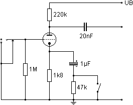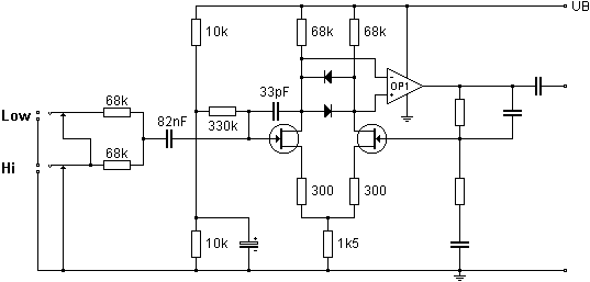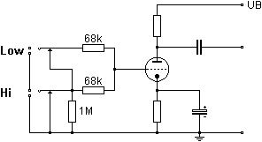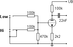 2. VerstärkerUnter dem Begriff "Verstärker" versteht der Musiker den Instrumentenverstärker, der das Signal soweit verstärkt, daß damit ein Lautsprecher betrieben werden kann. Abseits dieser etwas engstirnigen Vorstellung findet man Verstärker in großer Anzahl in alle elektronischen Geräten für die Elektrogitarre. Eigentlich ist der Instrumentenverstärker nichts anderes als eine sehr leistungsfähige Anpassungsschaltung, die eine geeignete Spannungsverstärkung liefert und diese über einen Impedanzwandler an eine definierte Last - hier der Lautsprecher - ausgibt. Insofern gibt es dort eigentlich keinen Funktionsblock. Die Praxis sieht jedoch ein wenig anders aus, denn der Instrumentenverstärker dient in gewisser Weise auch als Effektgerät: Die Klangeinstellung, die Möglichkeit eine nichtlineare Verzerrung zu erzeugen, sowie ein gegebenenfalls vorhandenes Tremolo oder gar ein Chorus sprechen da eine deutliche Sprache. Moderne Geräte bieten darüber hinaus noch die Möglichkeit, externe Effektgeräte in den Signalweg einzuschleifen. Über diese sogenannten Einschleifwege (engl. Effect-Loop) wird übrigens auch eine interne Hallspirale angeschlossen. In diesem Fall ist jedoch eine besondere Anpassung erforderlich. Ein normaler Einschleifweg ist zum Anschluß einer Hallspirale also nicht geeignet! Bild 5: Schalenmodell eines Instrumentenverstärkers mit Einschleifwegen Über Verstärker, speziell über Endstufen und die dazugehörenden Lautsprecher sind mittlerweile "unendlich" viele Bücher geschrieben worden. Zu weit wollen wir uns hier also nicht in Details verstricken. Eine wichtige Größe stellt jedoch der Dämpfungsfaktor dar, der das Verhältnis von Lautsprecherimpedanz und Ausgangswiderstand der Endstufe darstellt. Je größer der Dämpfungsfaktor ist, desto präziser folgt die Lautsprechermembran der angelegten Signalspannung. In der Praxis tritt jedoch immer eine gewisse Verzögerung auf, die durch die träge Masse der Membran begründet ist. In HiFi-Verstärkern ist man bestrebt, einen möglichst großen Dämpfungsfaktor zu erreichen. Als gut gelten hier Werte ab 50 aufwärts, die bei einer Lautsprecherimpedanz von 8Ohm immerhin einen Ausgangswiderstand von 0,16Ohm erfordern! Einen solchen Wert erreicht man nur mit modernen Transistorverstärkern, die als Ausgangsstufe einen Spannungsfolger verwenden. Röhrenendstufen arbeiten mit der Kathodenschaltung, die mit der Emitterschaltung eines bipolaren Transistors zu vergleichen ist. Hier gibt es quasi einen festen Ausgangswiderstand, der mit Hilfe des Übertragers an die Lautsprecherimpedanz angepaßt wird. Um eine optimale Leistungsübertragung zu erreichen, arbeitet man hier mit der Leistungsanpassung, das heißt, daß der Ausgangswiderstand der Endstufe gleich dem Widerstand des Lautsprechers ist. Damit beträgt der Dämpfungsfaktor also nur 1. In der Folge kann der Lautsprecher ein gewisses Eigenleben entwickeln, denn er ist nicht so fest an die Endstufe gekoppelt, was sich in einer klanglichen Einfärbung äußert. Dieser Unterschied zum Transistorverstärker ist ein Bestandteil des sogenannten "Röhren-Sound". Nachdem wir die Ausgangstufe eines Verstärkers quasi kurz und schmerzlos abgehandelt haben, wenden wir uns nun der Eingangsstufe zu. "Gott sprach: Es werde Licht. Und es wurde Licht." Dieser Satz aus Genesis 1,2 könnte auch für den Instrumentenverstärker gelten, denn schon mit den ersten Geräten, die in den frühen 30er Jahren des letzten Jahrhundert entwickelt wurden, verbreitete sich das warme Glühen der Elektronenröhren auf Bühnen und in Probenräumen und ist bis heute nicht erloschen, denn "Gott sah, daß das Licht gut war." (Genesis 1,4). Seit dieser Zeit hat sich die Eingangsschaltung eines Röhrenverstärkers im Grunde genommen nicht verändert. Für den Eingangswiderstand von Gitarrenverstärkern hat sich dadurch quasi eine Art Standard etabliert, der letztendlich historisch begründet ist. Bei Geräten, die über zwei unterschiedlich empfindliche Eingänge verfügen, beträgt er 1MOhm für "Hi" und 136kOhm für "Low". Bild 6: Typische Eingangsstufe eines Röhrenverstärkers (Fender, Marshall, Vox) Die beiden 68kOhm-Widerstände haben dabei mehrere Funktionen: Sie dienen zum einen als sogenannter "Grid Stopper" der einerseits einen eventuell auftretenden Gitterstrom begrenzt, andererseits zusammen mit der Eingangskapazität der Röhre einen Tiefpaß bildet. Die Eingangskapazität besteht aus der Summe der Gitter-Kathoden-Kapazität und der von der Verstärkung und der Gitter-Anoden-Kapazität abhängigen "Miller-Kapazität". Hier können bei einer ECC83, je nach eingestellter Verstärkung, Werte bis zu 150pF entstehen. Der daraus entstehende Tiefpaß hat dann eine Grenzfrequenz von rund 15kHz. Höhere Frequenzen werden also gesperrt. Damit wird verhindert, daß Signale von Rundfunksendern in die Röhre gelangen und dort demoduliert und damit hörbar werden. Die 68kOhm sind also wertmäßig nicht "vom Himmel gefallen"! Beide Widerstände bilden, wenn das Signal an "Low" angeschlossen wird, einen Spannungsteiler, durch den die Eingangsspannung halbiert wird. Damit ist "Low" dann also nur halb so empfindlich wie der "Hi"-Eingang. Gibson verwendet im "GA-40 Les Paul" ebenfalls dieses Schaltungskonzept. Allerdings werden hier statt 68kOhm Grid Stopper mit einem Widerstand von 51kOhm verwendet. Damit beträgt der Eingangswiderstand 102kOhm und 1MOhm. Im "GA-60 Hercules" gibt es eine weitere Variante mit Grid Stoppern von 100kOhm. Der 1MOhm-Widerstand wird durch 470kOhm ersetzt und hinter den Grid Stoppern positioniert. Resultat: 182kOhm und 570kOhm. Bild 7: Eingangsstufe eines Gibson GA-60 Hercules Bermerkenswert ist hier das Fehlen des Kathodenkondensators. Dadurch entsteht eine starke Gegenkopplung, welche die Verstärkung verringert. Vermutlich hat man damit das Ziel verfolgt, einen möglichst "sauberen" Klang zu erzeugen, indem man konsequent den Klirrfaktor herabsetzte. Die amerikanische Firm