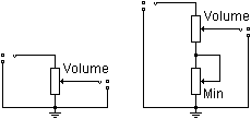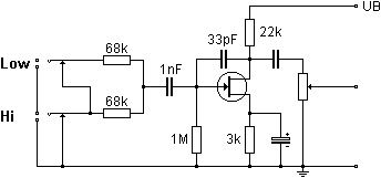 Beide Maßnahmen dienen also dem selben Zweck. Allerdings darf man zu Recht die Frage stellen, ob denn nicht eine der beiden Vorsichtsmaßnahmen bereits ausreichend ist? Bei den Ausgangsschaltungen trifft man also auf zwei grundsätzliche Typen: Den bipolaren Spannungsfolger gemäß Bild 23 und den Operationsverstärker. Während sich beim OP leicht größere Verstärkungen einstellen lassen, bleibt der Spannungsfolger immer ein wenig unter 1. Allerdings existiert hier nicht die Gefahr einer unerwünschten Schwingneigung, da diese Schaltungen nicht über eine große Leerlaufverstärkung und eine Rückkopplung verfügen. Auch ein weiterer Vorteil des bipolaren Spannungsfolgers soll nicht verschwiegen werden: Mit ihm lassen sich in der Regel größere Ausgangsspannungen erzeugen. Bei eine Betriebsspannung von 9V stehen bei dem Operationsverstärker TL081 typisch 5,6V für den Signalhub am Ausgang zur Verfügung. Den Rest der Spannung benötigt der Operationsverstärker zum Betrieb. Der diskrete Spannungsfolger ermöglicht bei der gleichen Betriebsspannung durchaus Amplituden von bis zu 4,2V, was einem Hub von 8,4V entspricht! Zum Schluß dieses Kapitels bleibt festzuhalten, daß es bezüglich der Ein- und Ausgangswiderstände bei Effektgeräten keine so großen Unterschiede gibt. Bei modernen Geräten beträgt der Eingangswiderstand in der Regel 470kOhm oder ist in Ausnahmen sogar noch größer. Der Ausgangswiderstand beträgt in den meisten Fällen 1kOhm oder weniger. Lediglich bei den Effektgeräten der ersten Generation, wie vielen klassischen Boostern und Verzerrern, aber auch WahWahs, die aus einfachen bipolaren Schaltungen bestehen, sind teilweise deutliche Abweichungen festzustellen. Eingangswiderstände unter 100kOhm oder Ausgangswiderstände über 10kOhm sind da häufig keine Seltenheit, wie das Beispiel des "Screaming Bird" zeigt. 3.3 Sonderfall Volume-PedalEigentlich gehört das Volume-Pedal nicht hierher, denn es arbeitet in der Regel vollständig passiv. Wenn man ein solches Pedal öffnet, so findet man in der Regel nur ein einziges Bauelement: Ein Potentiometer! Etwas teurere Varianten bieten zusätzlich die Möglichkeit, eine Mindestlautstärke einzustellen. Man kann mit Hilfe des Pedals dann stufenlos zwischen der minimalen und der maximalen Lautstärke hin- und herschalten. Bild 25: Die Schaltung verschiedener Volume-Pedale Die Stereo-Version eines solchen Pedals unterscheidet sich nur dadurch, daß die Schaltung in zweifacher Form existiert und statt der Einzel-Potis entsprechende Tandems verwendet werden. Volume-Pedale gibt es meist in einer hoch- und einer niederohmigen Version. Die meisten Hersteller schweigen sich über die Kennwiderstände der verwendeten Potentiometer aus. Unwichtig ist diese Angabe allerdings nicht! Bei den hochohmigen Geräten findet man in der Regel Potis mit einem Kennwiderstand von 470kOhm. Sie sind daher für den Einsatz mit der Elektrogitarre gedacht. In den niederohmigen Versionen findet man häufig 10kOhm oder 25kOhm. Ihr Einsatzgebiet ist das Keyboard oder in der Effektkette einer Elektrogitarre (aber nicht davor). Potentiometer gehören zu den Verschleißteilen und Gitarristen mögen kratzende Potis, insbesondere in einem Volume-Pedal, überhaupt nicht. Die englische Firma Morley hatte da schon in den 70er Jahren eine Lösung: Das Potentiometer wurde durch einen Spannungsteiler, bestehend aus einem Festwiderstand und einem lichtempfindlichen Widerstand (LDR), ersetzt. In der Nähe des LDR befindet sich eine Glühlampe, deren Helligkeit durch das Poti eingestellt wird. Bild 26: Der Signalpfad des Morley-Volume-Pedal Die durch ein kratzendes Poti verursachten Störungen wurden durch die Trägheit der Lampe unterdrückt und der teure Austausch des defekten Potis war nicht mehr notwendig. Dafür mußte man allerdings ab und zu eine defekte Lampe ersetzen. Man kann eben nicht alles haben. Auch wenn das Netzkabel am Morley-Volume den Verdacht nahelegte, es handle sich dabei um ein aktives Gerät, ist der Signalpfad vollständig passiv aufgebaut, wie Bild 26 zeigt. Prinzipbedingt kann das Signal nicht vollständig auf "Null" gebracht werden, da der Ausgang des Gerätes immer über den 68kOhm-Widerstand mit Masse verbunden ist. Ein weiterer Unterschied gegenüber den klassischen Volume-Pedalen besteht im Eingangswiderstand. Da beim Morley nur einer der beiden Widerstände verändert wird, sinkt der gesamte Widerstand mit der Lautstärke. Durch ihre komplette "Passivität" beeinflussen die Volume-Pedale stark das Übertragungsverhalten. Häufig wird ein solches Pedal direkt nach der Gitarre eingesetzt. Hier sind dann zwei Effekte zu bemerken: