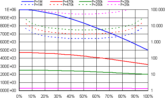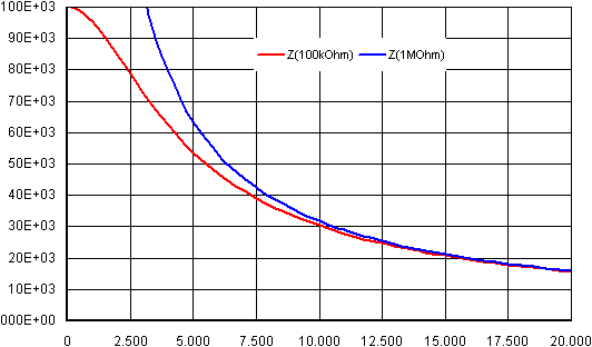 Beide Effekte sind (leider) von der Stellung des Pedals abhängig. Im folgenden Bild wurde der Eingangswiderstand, oder besser gesagt der für die Gitarre wirksame Lastwiderstand, für verschiedene Pedalstellung (0% bis 100%) und Poti-Werte berechnet. Dabei wurde davon ausgegangen, daß das Pedal über ein 5m langes Kabel (500pF) mit einem Verstärker verbunden ist, dessen Eingangswiderstand 1MOhm beträgt. Um die Sache gründlich zu machen, wurde zusätzlich die Grenzfrequenz des entstehenden Tiefpasses gestrichelt hinzugefügt. Bild 27: Eingangswiderstand und Grenzfrequenz eines Volume-Pedals bei verschiedenen Pedalstellungen Man erkennt, daß sich der Eingangswiderstand beim 1MOhm-Poti stark verändert. Er ist jedoch noch so groß, daß sich die entstehende Dämpfung der Resonanz in Grenzen hält. Anders sieht es jedoch mit der Grenzfrequenz aus. Schon bei 90% geht über 3,8kHz nichts mehr. Bei 50% sind es dann nur noch 1,6kHz. Im Hinblick auf die Grenzfrequenz liefert das 25kOhm-Poti die besten Ergebnisse. Selbst bei 50% sind noch mehr als 50kHz drinne, was den "Bedarf" der Elektrogitarre weit überschreitet. Aber leider ist der (relativ konstante) Eingangswiderstand von 25kOhm der "Killer" für jede Tonabnehmerresonanz. Der Einsatz eines passive Volume-Pedals direkt nach der Gitarre ist daher immer mit gewissen klanglichen Einbußen verbunden. Ein paar Höhen bleiben dabei also immer auf der Strecke. Abhilfe ist nur möglich, wenn man das Pedal durch geeignete Buffer vom Rest der Signalkette entkoppelt. Man benötigt also ein geeignetes aktive Interface. |